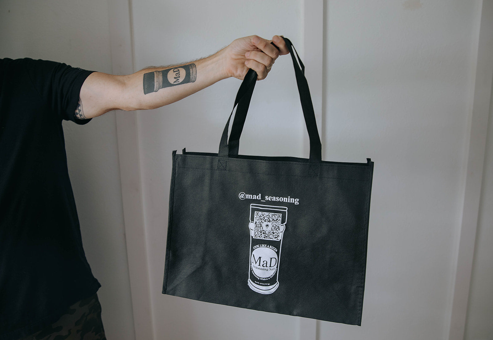 This bag is ready to haul whatever you throw its way. Featuring our iconic MaD White Seasoning bottle design, it holds way more than it looks. Plus, with our QR code right on it, running out of MaD Seasoning is off the table—just scan and restock with ease!